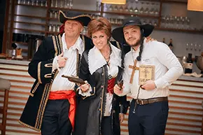 Мы подберём для вас кафе, идеально подходящее для игры. В зависимости от количества гостей: просторное, с несколькими залами или одну уютную комнату. Постараемся, чтобы интерьер подчеркнул атмосферу сценария — средневековая таверна, литературный салон или палуба корабля.